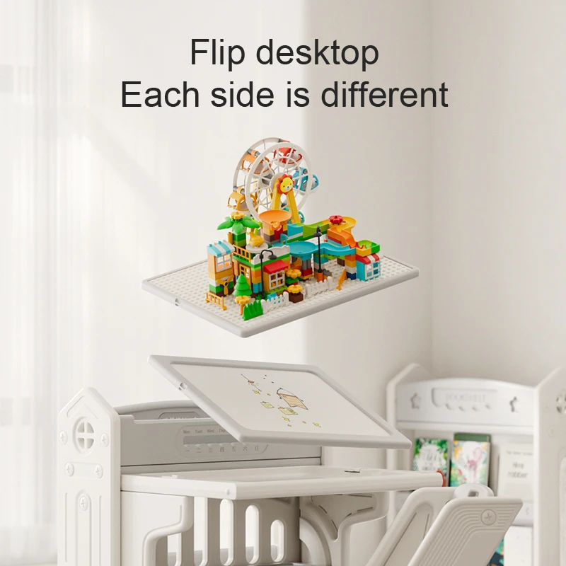 This innovative children's furniture set combines the functionality of a study desk, dining table, and interactive play surface with integrated building block compatibility. The robust plastic construction ensures durability while maintaining child-safe design standards throughout every component. The table features a specially designed surface that accommodates various building block systems, enabling children to construct, learn, and play while seated comfortably at an appropriate height for their developmental stage.